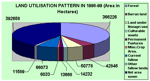 The district accounted for 7.4 % of the geographical area of the state. Of the total 9.62 lakh hectares of land, nearly 38 % is occupied by forest and the net sown area accounted for 40.7 %. Following table shows the land use pattern in the district during 1999-2000.