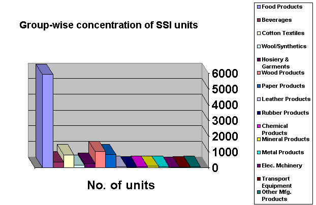 Dharmapuri district accounted for 2.7 % of the registered SSI units in Tamilnadu as on 31.3.2001. There were 9611 registered SSI units in the manufacturing sector and 3168 units in the servicing sector (SSSBE). More than 60 % of the units are engaged in manufacture of food products.